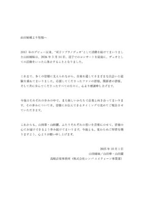 これからも、山田華・山田麗、ふたりそれぞれの想いを音楽にのせて、皆様の心にお届けできるよう歩み続けてまいります。今後とも、変わらぬご厚情を賜りますよう、心よりお願い申し上げます。